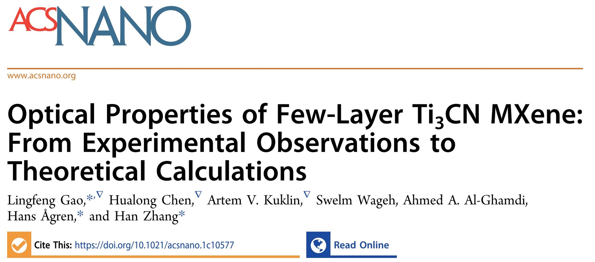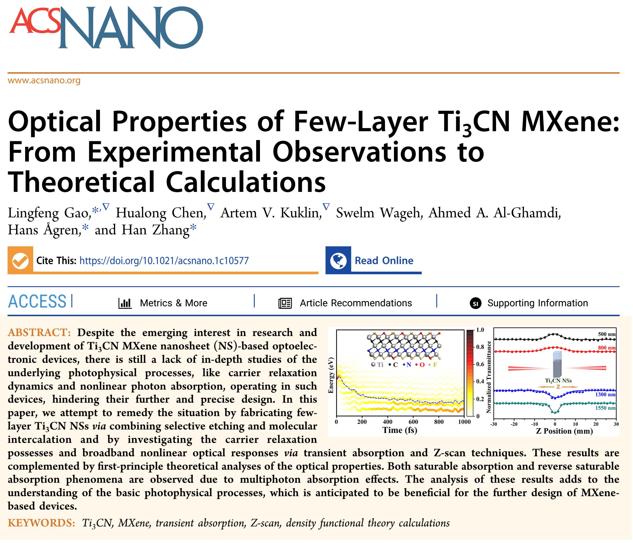 近日,杭州师范大学高凌锋副教授与深圳大学张晗教授以及乌普萨拉大学Hans Ågren教授合作系统研究了少层Ti3CN MXene的光学性质。团队近两年在少层MXene材料方面积累了丰富的经验,例如总结了MXene/聚合物复合薄膜(Chem. Mater., 2020, 32, 1703-1747,ESI高被引)和首次提出异质MXene的概念(Adv. Mater., 2021, 33, 2004129),系统对比了Ti3C2和Ti3CN的非线性光学行为(Nanoscale, 2021, 13, 15891-15898),研究了少层Nb2C MXene的非线性光学行为(Small Methods, 2020, 4, 2000250),并以此指导基于Nb2C的飞秒锁模光纤激光器和光电探测器的构建(ACS Nano, 2021, 15, 954-965,ESI高被引;Mater. Today Phys., 2021, 21, 100479)以及拓展少层Nb2C在全光调制(Nanophotonics, 2021, 10, 2617-2623)和可饱和吸收体(Opt. Laser Technol., 2021, 142, 107199)方面的应用等。在本项工作中,团队采用氢氟酸刻蚀和小分子插层的手段制备出具有高质量的少层Ti3CN MXene,随后通过瞬态吸收和Z-扫描技术对Ti3CN MXene的光学性质展开研究,结合第一性原理计算揭示了其载流子动力学和宽带非线性光学响应行为。结果显示,该少层Ti3CN MXene具有超快弛豫时间,其非线性光学行为可随波长的变化而调节,预期在光电器件领域将展现出巨大的应用前景。相关成果以 “Optical Properties of Few-Layer Ti3CN MXene: From Experimental Observations to Theoretical Calculations”为标题发表于国际纳米科技著名期刊《ACS Nano》上。
