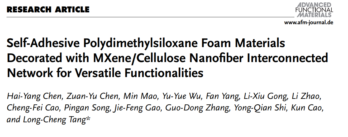 近日,我校材料与化学化工学院汤龙程教授团队基于有机硅分子交联/发泡反应机制,提出一种自粘型硅橡胶泡沫材料的设计思路,并制备出高性能PDMS泡沫纳米复合材料。该材料具有轻质弹性、绿色阻燃、可调节导电、以及优异的耐高低温和耐水性等特性,在复杂环境智能医疗监测和防火隔热等方面具有良好的银应用前景。相关研究成果以题为“Self-Adhesive Polydimethylsiloxane Foam Materials Decorated with MXene/Cellulose Nanofiber Interconnected Network for Versatile Functionalities”发表于国际材料领域权威期刊Advanced Functional Materials (2023,IF=19)上。
