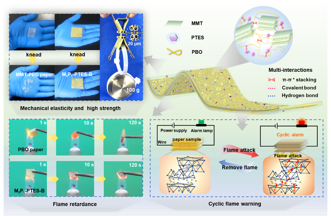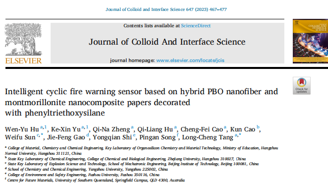 近日,我校材料与化学化工学院汤龙程教授团队设计研发的一种纳米复合材料在循环阻燃智能预警等方面取得新进展,相关研究成果以题为“Intelligent cyclic fire warning sensor based on hybrid PBO nanofiber and montmorillonite nanocomposite papers decorated with phenyltriethoxysilane”发表于国际知名期刊Journal of Colloid and Interface Science(IF=9.965)上。