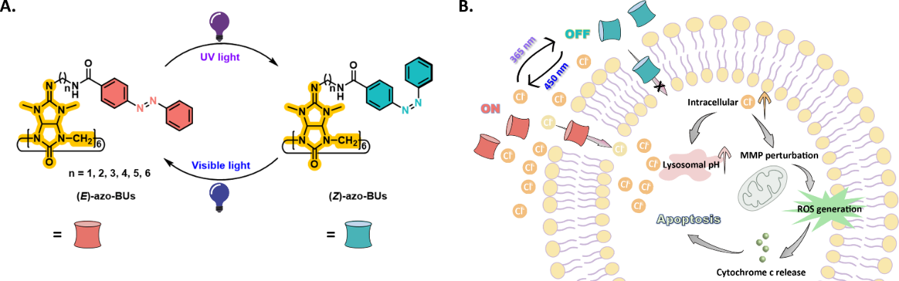 近日,金沙娱乐城 材料与化学化工学院刘俊秋教授团队在仿生超分子阴离子通道领域取得新进展,相关研究成果以题为“Rhodopsin-Mimicking Reversible Photo-switchable Chloride Channels Based on Azobenzene-Appended Semiaza-Bambusurils for Light-Controlled Ion Transport and Cancer Cell Apoptosis”发表于国际知名期刊Angewandte Chemie International Edition上。
