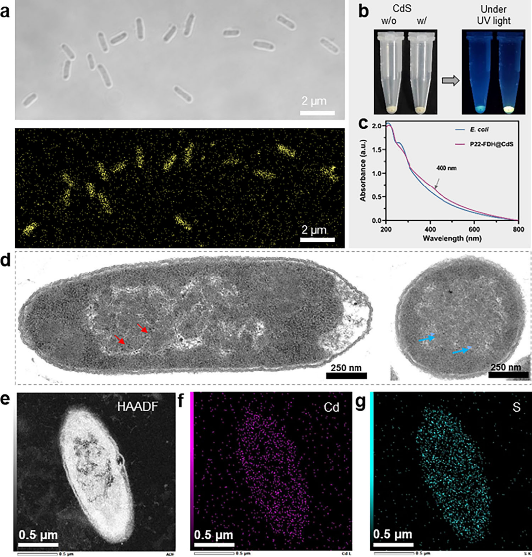 2.蛋白笼保护模块:对P22噬菌体来源的蛋白笼进行基因工程改造,使其内部封装甲酸脱氢酶,同时在外表面展示高密度的镉结合肽。该模块既能像“盔甲”一样保护酶免受恶劣环境(如金属离子、极端pH/温度)的侵害,又能作为模板引导CdS量子点的有序形成,并在物理上隔离光催化剂与酶,避免酶活性中心的损伤。