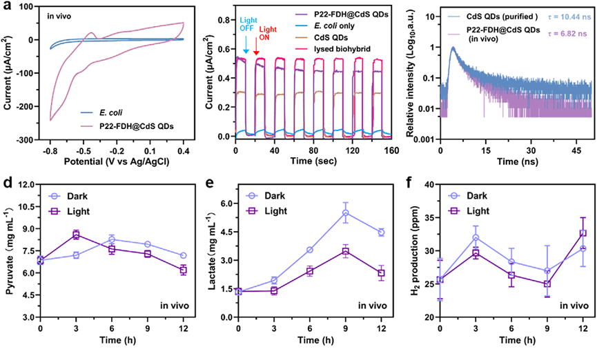 电化学与荧光寿命分析表明,活细菌代谢与光生电子之间存在协同作用,有效促进了NADH再生与CO2固定。机理研究表明,活细菌内的光生电子不仅可能通过菌体自身分泌的氧化还原介体(如黄素蛋白)间接促进NAD⁺还原,更重要的是,它能够干预并重编程细胞的代谢。光照促进了丙酮酸的积累,并抑制了消耗NADH的乳酸发酵途径,从而将更多的还原力导向FDH催化的CO2还原反应(图5)。