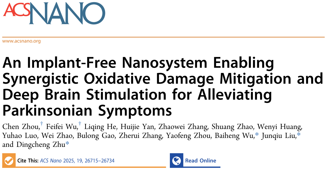 近日,杭师大金沙娱乐城 刘俊秋教授团队在神经Ca2+信号激活的交叉研究领域取得突破性进展,相关研究成果以题为“An Implant-Free Nanosystem Enabling Synergistic Oxidative Damage Mitigation and Deep Brain Stimulation for Alleviating Parkinsonian Symptoms”发表于ACS Nano(IF = 15.4)。