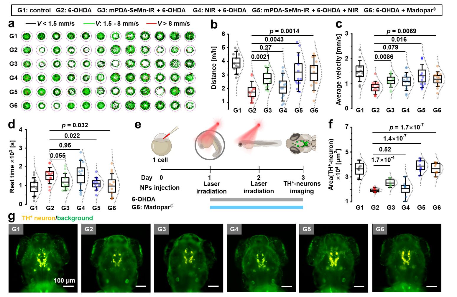 进一步的体内研究表明,在斑马鱼模型中,脑腔室注入mPDA‑SeMn‑IR并用1064 nm激光照射,可激活中脑神经元中的 Ca2+和电生理信号(图2h,i);在胚胎阶段,可加速斑马鱼盘绕行为(图2j,m),验证了神经调控的有效性。更重要的是,在斑马鱼帕金森模型中,单纯抗氧化或单纯光热刺激组虽有一定疗效,但与临床一线药物多巴丝肼相比仍有差距;而抗氧化协同深部脑刺激组则表现出最优的运动能力恢复和神经元保护效果,媲美药物治疗效果(图3)。
