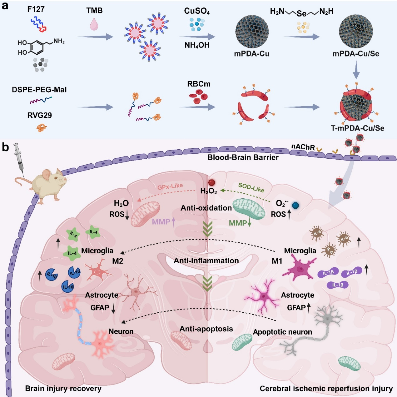 基于此,杭州师范大学刘俊秋团队开发了T-mPDA-Cu/Se仿生靶向级联纳米酶:将天然抗氧化酶——超氧化物歧化酶(SOD)和谷胱甘肽过氧化物酶(GPx)的关键催化位点铜(Cu)和硒(Se)元素嵌入介孔聚多巴胺(mPDA)支架,通过级联SOD-GPx催化活性高效清除再灌注产生的ROS。该纳米酶包覆在RVG29血脑屏障穿透肽修饰的红细胞膜(RBCm)中,通过受体介导的跨细胞转运实现对缺血性脑组织的靶向积累,同时逃避免疫清除。在短暂性大脑中动脉闭塞(tMCAO)大鼠模型中,T-mPDA-Cu/Se递送至缺血部位积累后,能够有效减轻神经元氧化损伤、抑制星形胶质细胞/小胶质细胞活化、下调促炎细胞因子、并减少梗死体积,展现出卓越的神经保护作用和生物安全性(图1)。