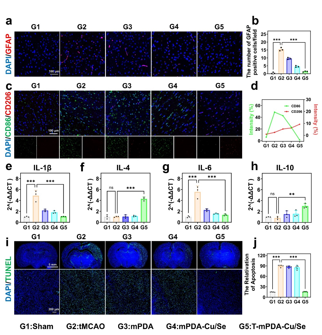 图4. T-mPDA-Cu/Se纳米酶的神经炎症抑制和抗细胞凋亡作用。