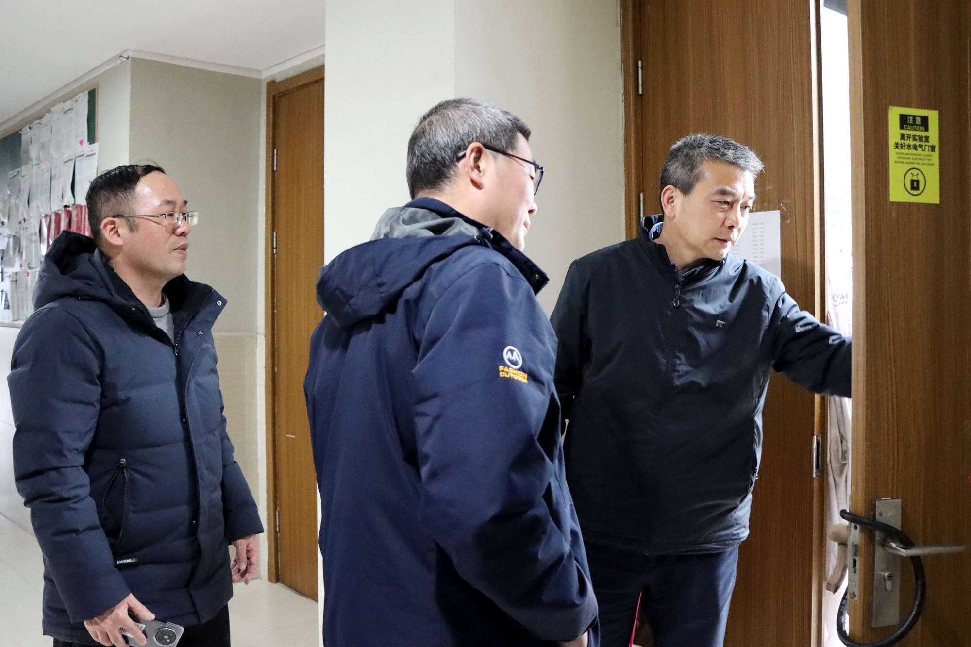 检查过程中,学院领导逐一走访每一间实验室,聚焦关键环节从严督导。重点围绕实验溶剂规范储存、实验废弃物分类处置、高温高压设备安全警示及应急预案落实等情况进行细致排查,现场查看安全操作规程执行、仪器设备运行及用电安全等状况。每到一处,都与在场师生深入交流,详细了解实验操作流程,反复强调严守安全规范、落实安全责任的重要性。对检查中发现的问题,现场提出具体整改建议,明确整改时限与要求,切实做到隐患“发现一处、整改一处”,坚决筑牢校园安全防线。