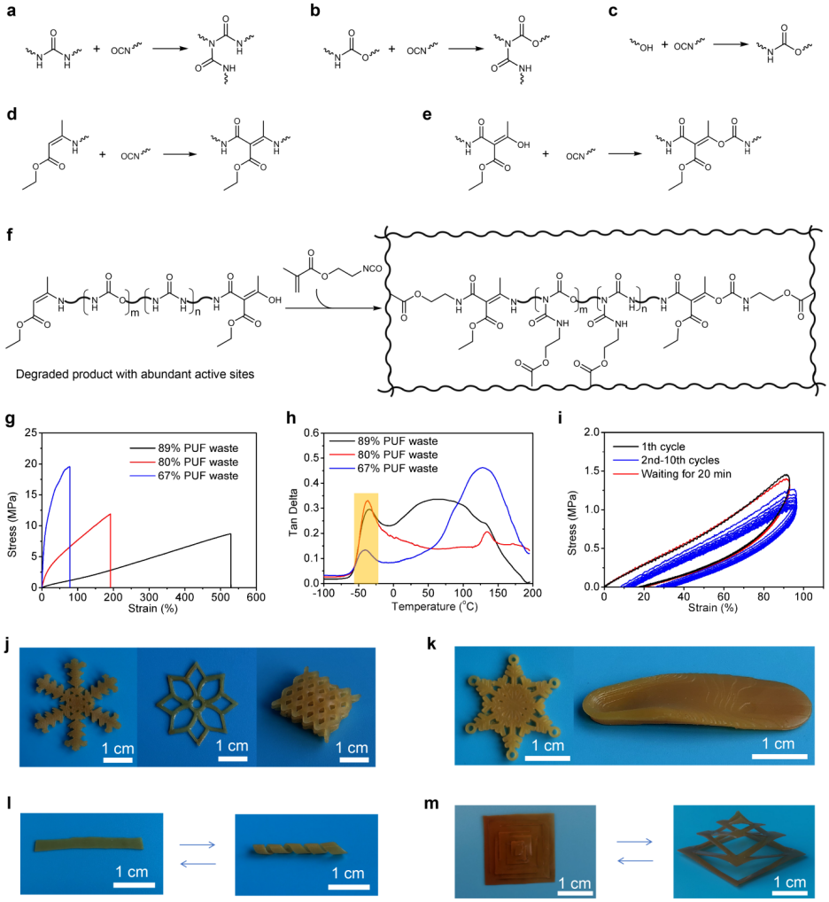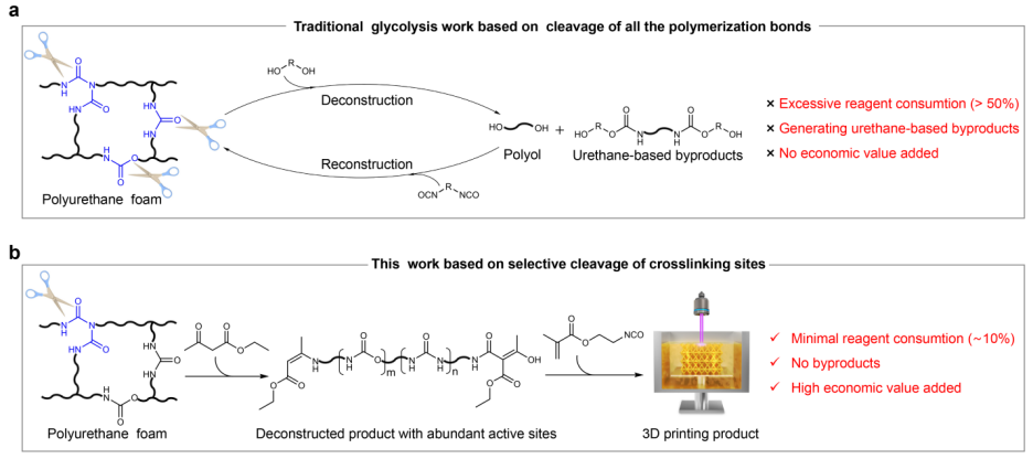 该研究的核心思想是实现交联位点的选择性断裂。对于商用聚氨酯泡沫,其分子网络主要由二异氰酸酯与多元醇反应构建,水同时作为反应物和发泡剂,生成含有氨酯键、脲键和缩二脲键的交联网络。其中,缩二脲键充当交联位点,而氨酯键和脲键主要存在于非交联区域。研究团队发现乙酰乙酸乙酯(EAA)作为一种广泛使用、价格低廉、具有愉悦果香味的食品添加剂,可实现缩二脲交联位点的快速、高效、完全断裂,同时几乎不影响非交联区域的氨酯键和脲键。通过这一策略,热固性聚氨酯泡沫被解交联为多元醇-异氰酸酯嵌段结构的解聚产物,这不仅最大限度减少了断键点数量和断键试剂消耗量,还有效避免了异氰酸酯副产物的生成。此外,所得解聚产物具有丰富的双活性位点(主链保留的脲键/氨酯键与末端新生基团),使其可用于制备高附加值的光固化3D打印产品,实现增值回收。