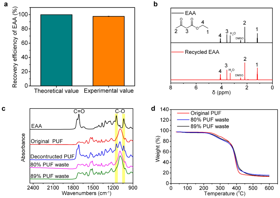 为实现上述解聚,研究团队将聚氨酯泡沫与EAA混合加热。在优化条件(180 ℃,25 min,EAA/PUF质量比1:1)下实现了聚氨酯泡沫的快速解聚。凝胶渗透色谱分析显示,解聚产物的重均分子量高达41,146 g mol⁻¹,表明选择性断键策略最小化了断键量,保留了高分子链的主体结构。