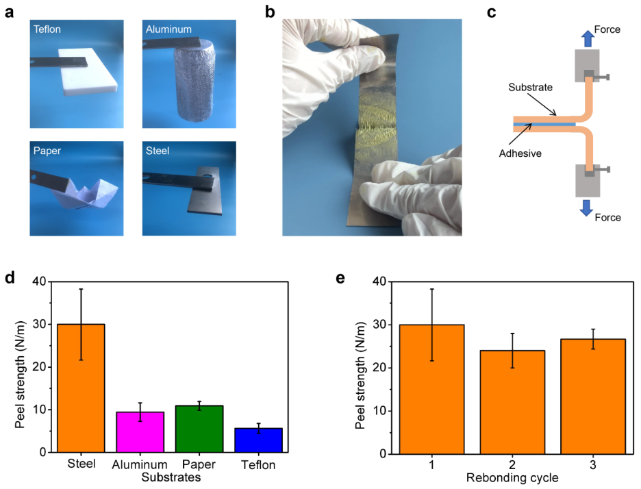研究团队进一步探讨了解聚产物的其他应用潜力。实验表明,解聚产物可直接用作压敏胶,对钢材、铝材、纸张和特氟龙等多种基材表现出良好粘附性和可重复使用性。此外,该材料还可作为合成聚氨酯的原料,或用作环氧树脂的固化/增韧剂。此外,基于解聚产物丰富的活性位点及其柔性链段,使其还具备作为环氧树脂固化剂/增韧剂以及聚氨酯合成原料的应用潜力。